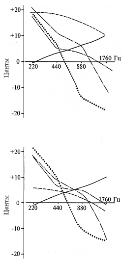 По оси абсцисс - частота, Гц; по оси ординат - отклонение величины интервала, центы. Сплошная линия - чистая октава, штрих-пунктир с одной точкой - чистая квинта, штрих-пунктир с двумя точками - чистая кварта, прерывистая линия - большая терция, пунктир - большая секунда.